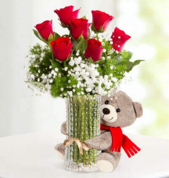 Silindir cam vazo içerisinde 7 adet kırmızı gül ve ayıcık diyarbakir nöbetci cicekci 7/24 cicekasepeti diyarbakir 05323490333