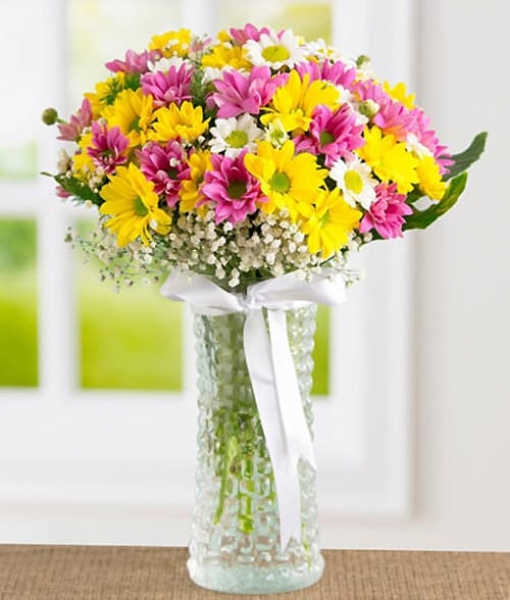 Silindir Cam Vazoda Rengarenk Papatyalar