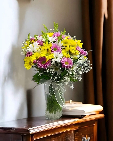 Silindir Cam Vazoda Rengarenk Papatyalar