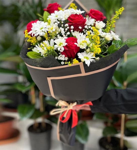 Siyah Tülde5 Adet Kırmızıgül ve Papatyalar