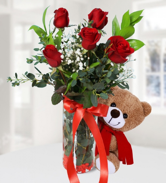 Klasik gibi gözüken bir aranjmana yapılan küçük bir dokunuşla sizlerin beğenisine sunulan bu tasarım içindeki peluş ayı ile hem aşkınızın tutkusunu hem de sevginizin sıcaklığını aynı anda hissettireceksiniz.