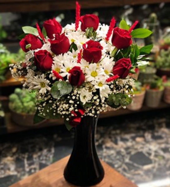 Siyah kalipso cam vazo içine hazırlanmış, gül ve papatyalardan oluşan bu tasarımla sevdiklerinize duygularınızı anlatmak oldukça kolay ve etkileyici görünüyor. Sizde bu tasarımımızla en özel günlerinizde sevdiklerinize mutluluk kaynağı olabilir hemen sipariş verebilirsiniz.