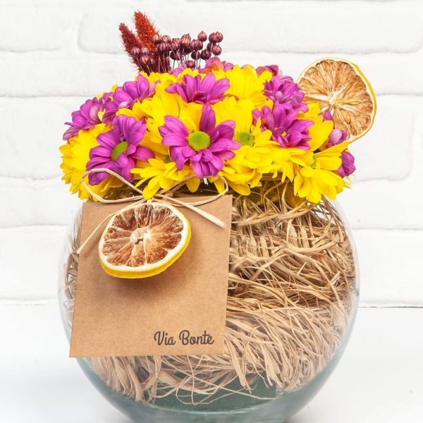 Bazen kutlama, bazen içimden geldi hediyesi, bazen tebrik, bazen de dile getirilemeyen duygulara tercüman olan sarı ve pembe papatyalar, en güzel halleriyle Magic Sphere aranjmanını süslüyor! Pembe papatya ve güller, şık cam küre vazso ve kuru süslemeleriyle birlikte en özel anlarınıza eşlik etmek için tasarlandı. Siz de çiçekler kadar taze bir anı yaratmak için Magic Sphere buketini anlamlı bir notla taçlandırabilirsiniz!