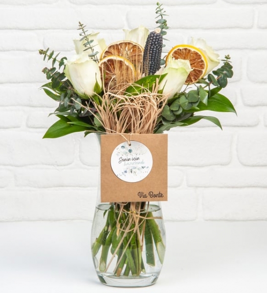 Beyaz güllerin zarifliği ve dinginliği, sizi aşk dolu bir atmosfere ışınlayan kokularla bir araya geldi! Adeta bir aşk bahçesini anımsatan bu özel aranjman, yoğun temposunda düşünceli bir çiçekle soluklanmasını istediğiniz herkes için ideal bir seçenek. Sadeliğin büyüleyen ve dinlendirici esintisini bu aranjmanla yaşam alanlarınıza taşıyabilir; kendinizi şımartırken sevdiklerinizi tatlı bir sürprizle gülümsetebilirsiniz.