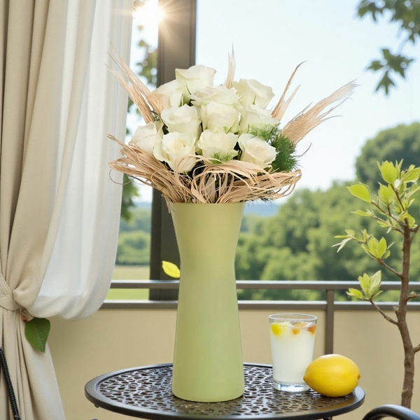 Saflığın, zarafetin ve yeni başlangıçların en naif ifadesi olan beyaz güller, şimdi estetik bir tasarımla buluştu. Özenle hazırlanmış yeşil çizgili polimer vazo içinde yer alan 12 adet ithal beyaz gül, mor kurdele detayıyla adeta bir zarafet şölenine dönüşüyor. Okaliptus, bej lagurus ve rafya dokunuşlarıyla doğallığı ve romantizmi bir araya getiren bu özel aranjman, sevdiklerinize duygularınızı en sade ama en etkileyici şekilde ifade etmenin zarif yoludur. Gerek doğum günü, yıl dönümü gibi özel günlerde gerekse sadece içinizden geldiği için, sevdiklerinize huzur dolu bir sürpriz sunmak isterseniz bu şık aranjman tam size göre. Her baktığında yüzlerde bir tebessüm, kalplerde ise unutulmaz bir iz bırakacak. Sıradan bir günü beyaz güllerin masum güzelleği ile unutulmaz bir anıya dönüştürebilir veya özel günleri harika bir hediye gülümseten anılara dönüştürebilirsiniz. Siparişiniz sonrasında çıkacak “Not oluşturma” sayfasında birkaç cümlelik not oluşturarak hediyenizi daha anlamlı bir hale getirmeyi unutmayın.