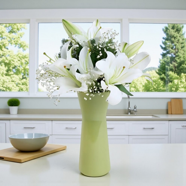 Doğallığın ve zarafetin birleştiği beyaz lilyumlar, yeşil cam vazo içinde modern ve şık bir sunumla sizlere ulaşıyor.