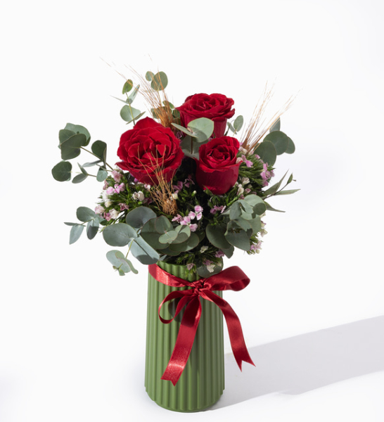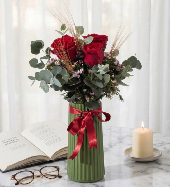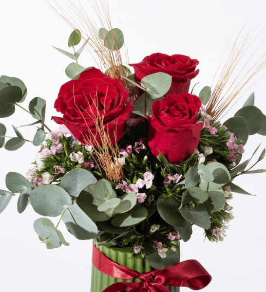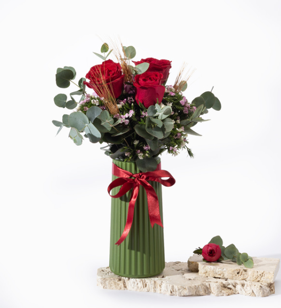 Sevdiklerinize olan duygularınızı en zarif şekilde ifade etmek için tasarlanmış bu çiçek aranjmanı, kırmızı güllerin tutkulu renkleriyle dikkat çeker. Hüsnüyusuf çiçeği aranjmana sakinlik katarken, başak buğdaylar doğal bir atmosfer yaratır. Yeşil çizgili polimer vazo ise modern bir görünüm sunar ve kırmızı kurdele ile şıklık tamamlanır. Bu özel tasarım, sevgi ve takdiri anlamlı bir şekilde yansıtmak isteyenler için ideal bir hediye seçeneğidir.