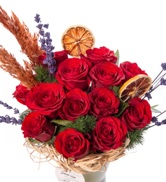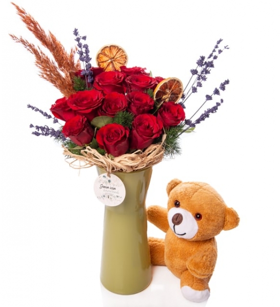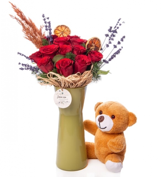 Kırmızı gül; sevginin, dile dökmekte bile zorlandığınız büyük duyguların ve aşkın sembolüdür. Bu nedenle de her durum ve her an için özel bir hediyedir. Yeşil Vazoda Kırmızı Güller ve Mutlu Ayıcık ile hem anlamlı hem de tatlı bir hediye vererek sevdiklerinizi mutlu edebilirsiniz. Zeytin yeşili cam vazo içerisinde sunulan kırmızı güllere eşlik eden lavantalar, mirkeladus süslemeleri ve pampas otlarının yanı sıra "Senin için hazırlandı" mini pankartı ve mutlu ayıcık gören herkesin yüzünde gülümsemeler oluşmasını sağlayacaktır. Yeni bir işe başlayan, yeni bir ev tutan veya kariyerinde özel bir an yaşayan sevdiklerinize hediye edebileceğiniz bu özel aranjmanı, sıradan bir günü özelleştirmek veya yılbaşı, Sevgililer Günü, Anneler Günü, doğum günü gibi özel günleri unutulmaz kılmak adına sipariş edebilirsiniz. Siparişiniz sonrasında çıkacak “Not oluşturma” sayfasında birkaç cümlelik not oluşturarak hediyenizi daha anlamlı bir hale getirmeyi unutmayın!