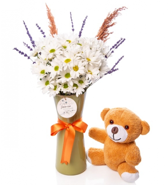 Ürün İsmi: Zeytin Yeşili Vazoda Beyaz Papatyalar&Mutlu Ayıcık